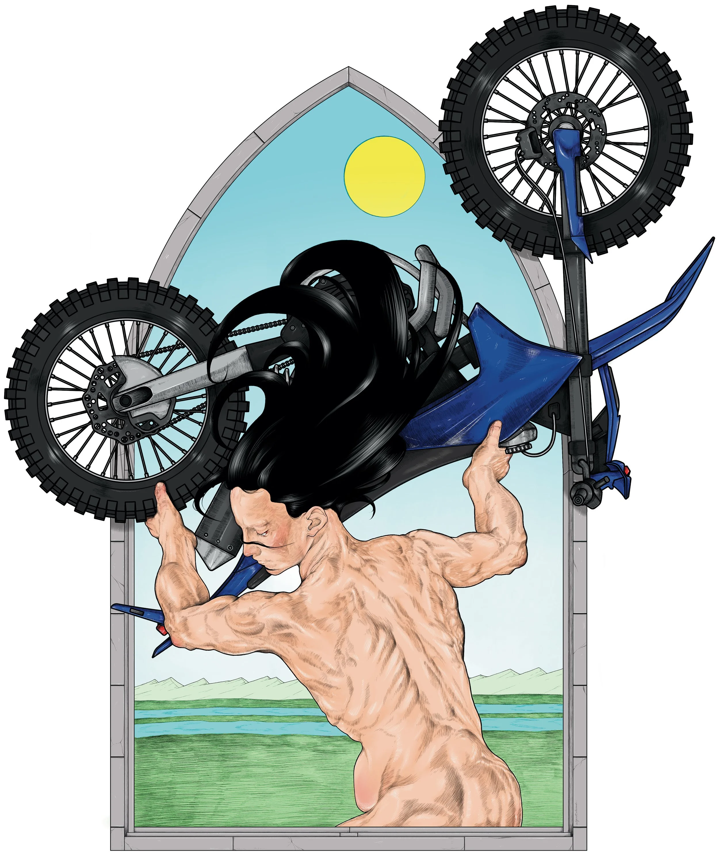 Cross is the first original work I created for Backa Teater’s 2026 to 2027 season. Made for the world premiere of Björn Elgerd’s play Cross, directed by Lars Melin, the work is a digital illustration created for the season opening. The image shows a body lifting and holding a cross motorbike within a Gothic arch structure. The motorbike is suspended rather than in motion, shifting the focus from speed to weight, strain, and the direct physical relationship between machine and flesh.